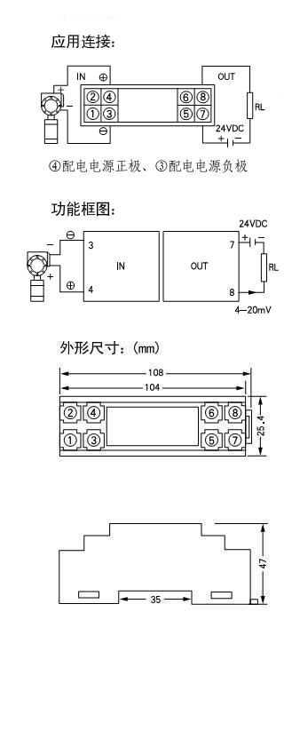 二线制4-20mA输出;二线制4-20mA输入;DIN T型导轨卡装方式。