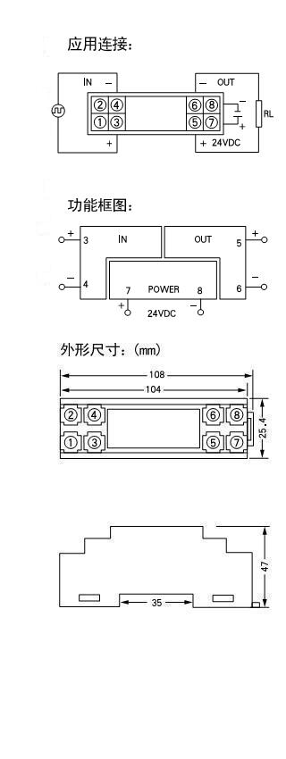 将频率信号转换为标准电压、电流信号;输入、输出与24VDC电源三者间相互隔离;DIN T型导轨安装