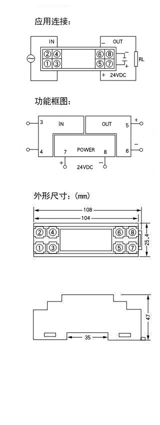 工频交流电压信号变换为工业仪表的标准信号;输入、输出与电源三者间相互隔离;DIN T型导轨安装。