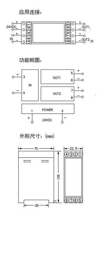 将输入信号变换为二路相互隔离的信号;低功耗 低热量 低漂移;DIN T型导轨安装、接线端子可插拔。